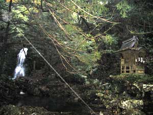 分かりにくいが、中央に小さく本殿、左端に滝が見えます。 |