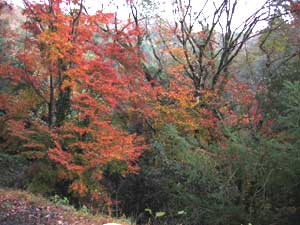 滝の上側、駐車場や道路がある辺りに数本の紅葉した木がありました。 時期に来ると紅葉が綺麗な所だそうです。 |