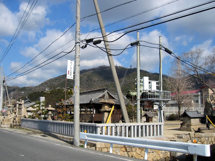 笠岡市神島外浦の海岸沿いを走る県道沿いに鎮座。 県道を挟んで目の前に瀬戸内海が広がり、高島などの笠岡諸島を臨みます。